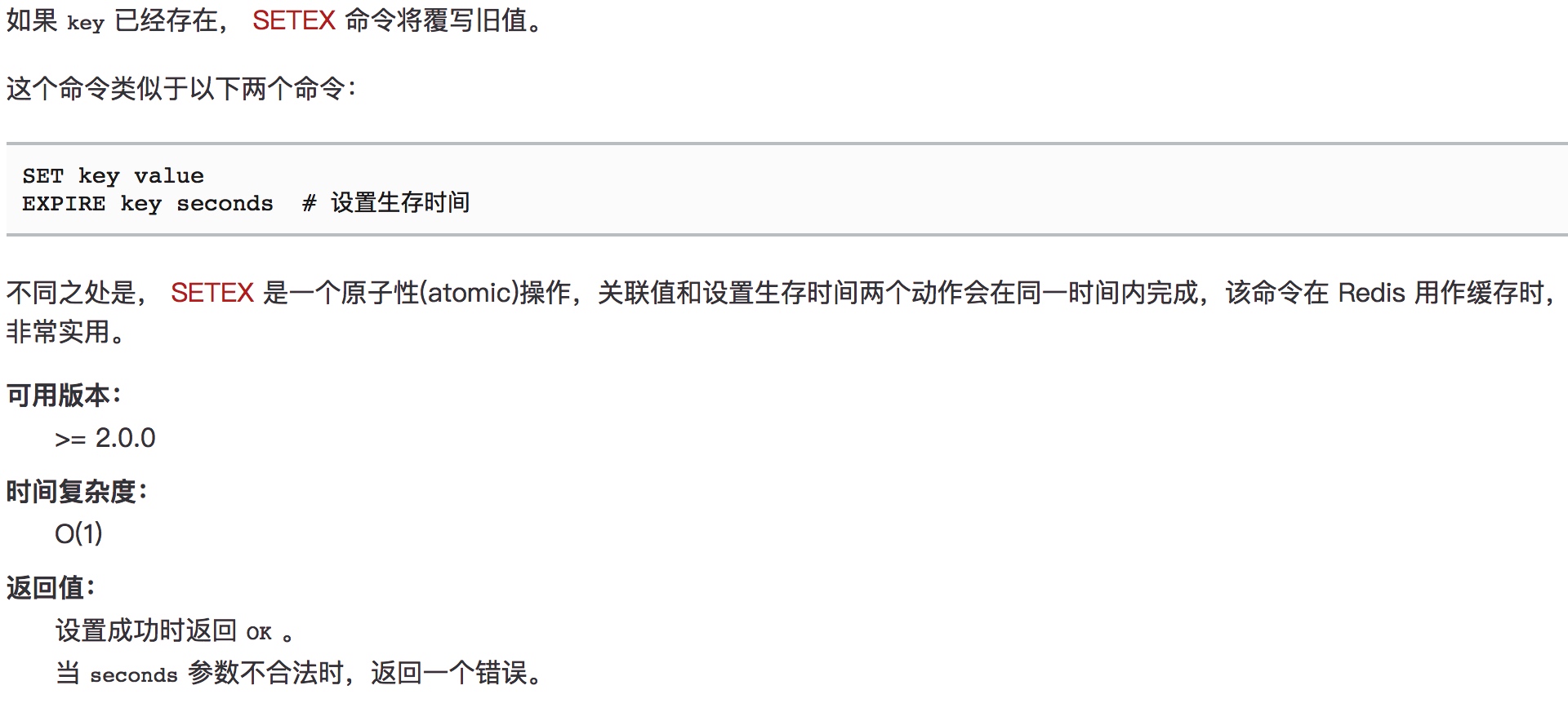 SETEX key seconds value 将值 value 关联到 key ,并将 key 的生存时间设为 seconds (以秒为单位)。
